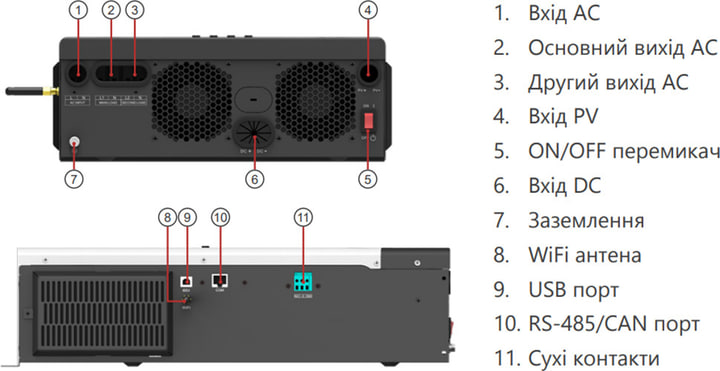 MPPT: 2×27А, сумарна потужність PV до 12 кВт