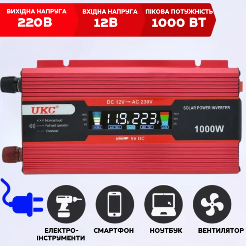 Інвертор-перетворювач AC/DC 1000W 12V з LCD-дисплеєм KC-1000D від VIKIR – це потужний та ефективний пристрій, призначений для перетворення напруги 12V постійного струму в 220V змінного струму. Ідеально підходить для живлення різних електроприладів під час поїздок, кемпінгу або у випадках відсутності доступу до електромережі. Завдяки високій потужності 1000 Вт та зручному LCD-дисплею для контролю за роботою, цей інвертор стане вашим надійним помічником у забезпеченні живлення в будь-яких умовах.