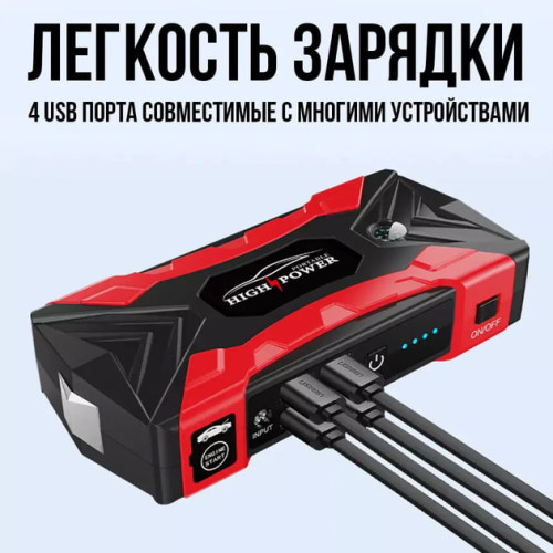 - Ємність 99800 мАг: Висока ємність дозволяє здійснювати кілька запусків автомобіля навіть при сильно розрядженому акумуляторі.