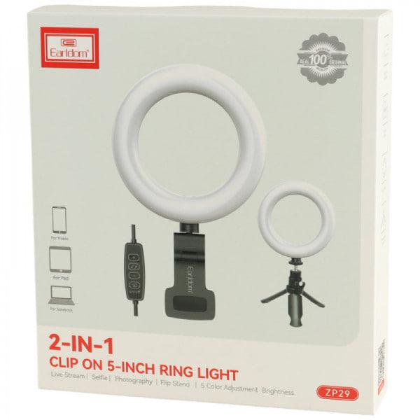 Earldom ET-ZP29 — сучасна кільцева LED-лампа діаметром 16 см, яка забезпечує професійне рівномірне освітлення для фото- та відеозйомки, блогів, стрімів, онлайн-уроків та відеоконференцій.