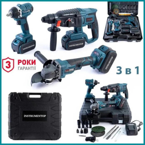 Instrumentop 3в1 — це професійний набір акумуляторних інструментів для тих, хто не визнає компромісів. Універсальний комплект для будівельників, монтажників, сервісних фахівців і майстрів, що цінують мобільність, потужність і надійність.