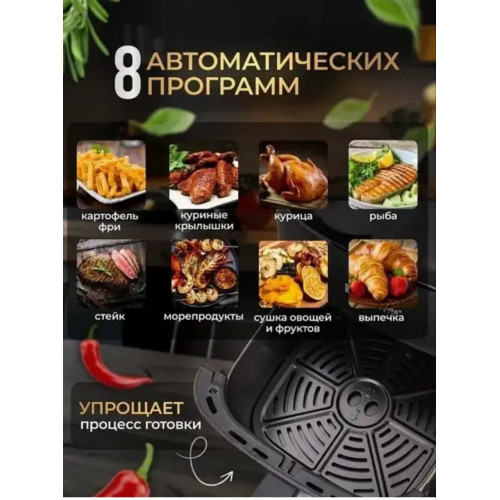 Об’ємна чаша на 8 літрів забезпечує можливість приготування великих порцій, що робить пристрій ідеальним для сімейних обідів та святкових застіль. Цифрове управління з автоматичними програмами дозволяє з легкістю обирати оптимальний режим для смаження, випічки, запікання чи сушіння.