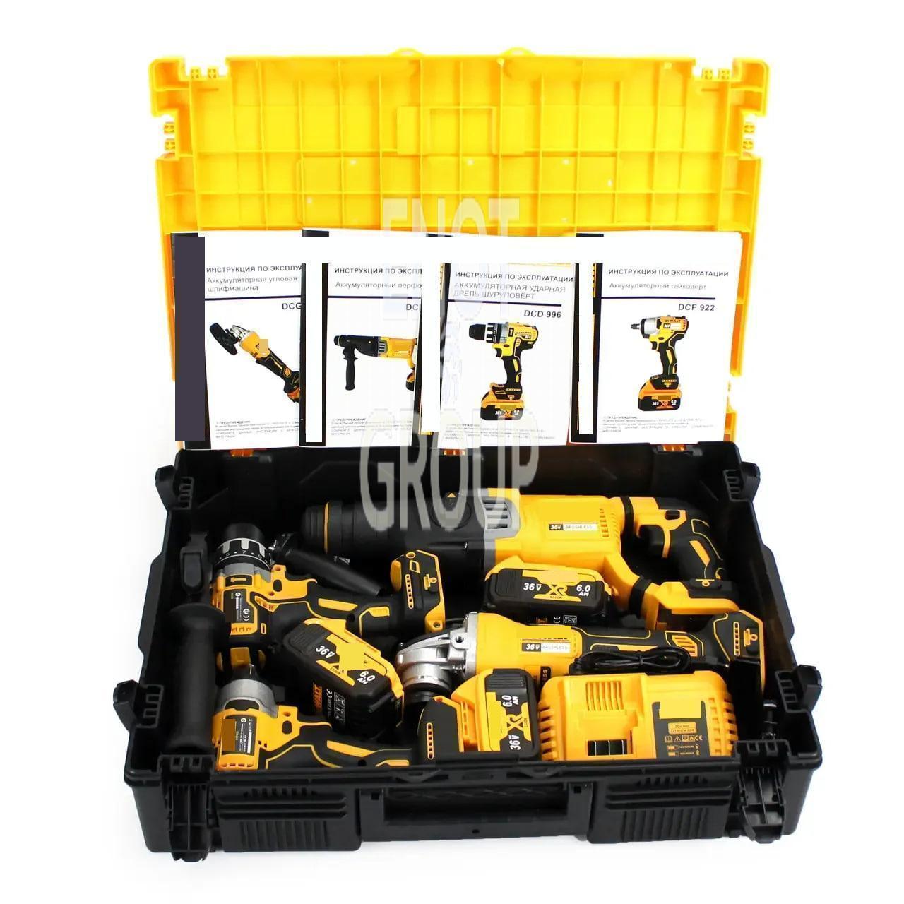 Комплектація: Шуруповерт, болгарка, перфоратор, гайковерт, зарядний пристрій, кейс