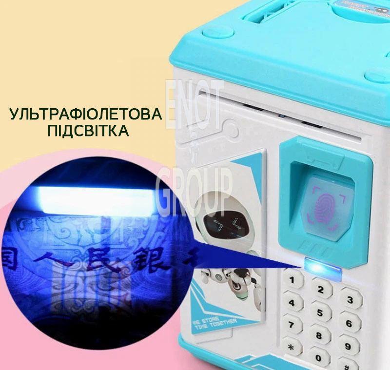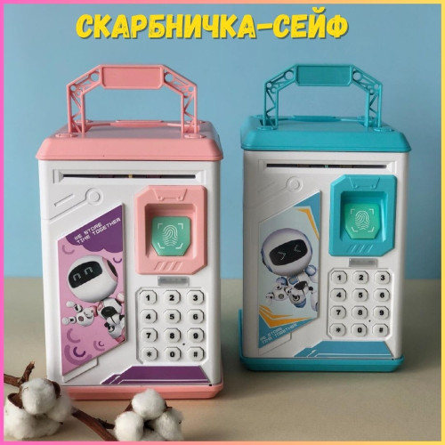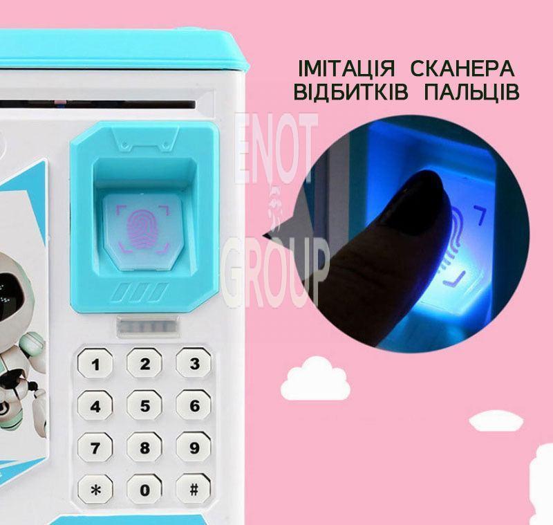 - Електронний кодовий замок: Забезпечує надійний захист дитячих заощаджень. Сейф відкривається після введення персонального 4-значного коду.