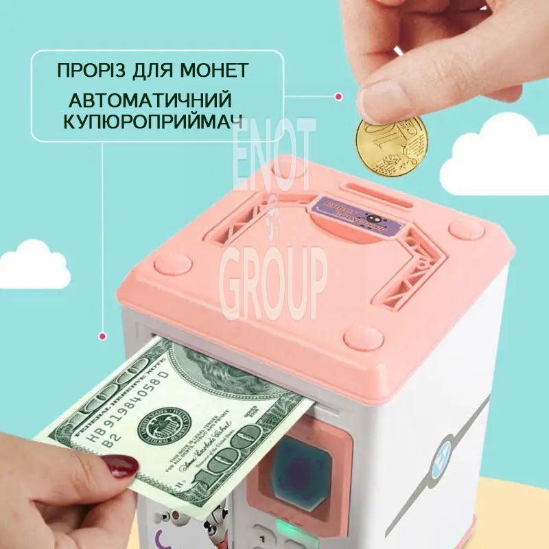 - Автоматичне втягування купюр: Копілка легко втягує паперові гроші через спеціальний отвір, що додає їй інтерактивності.