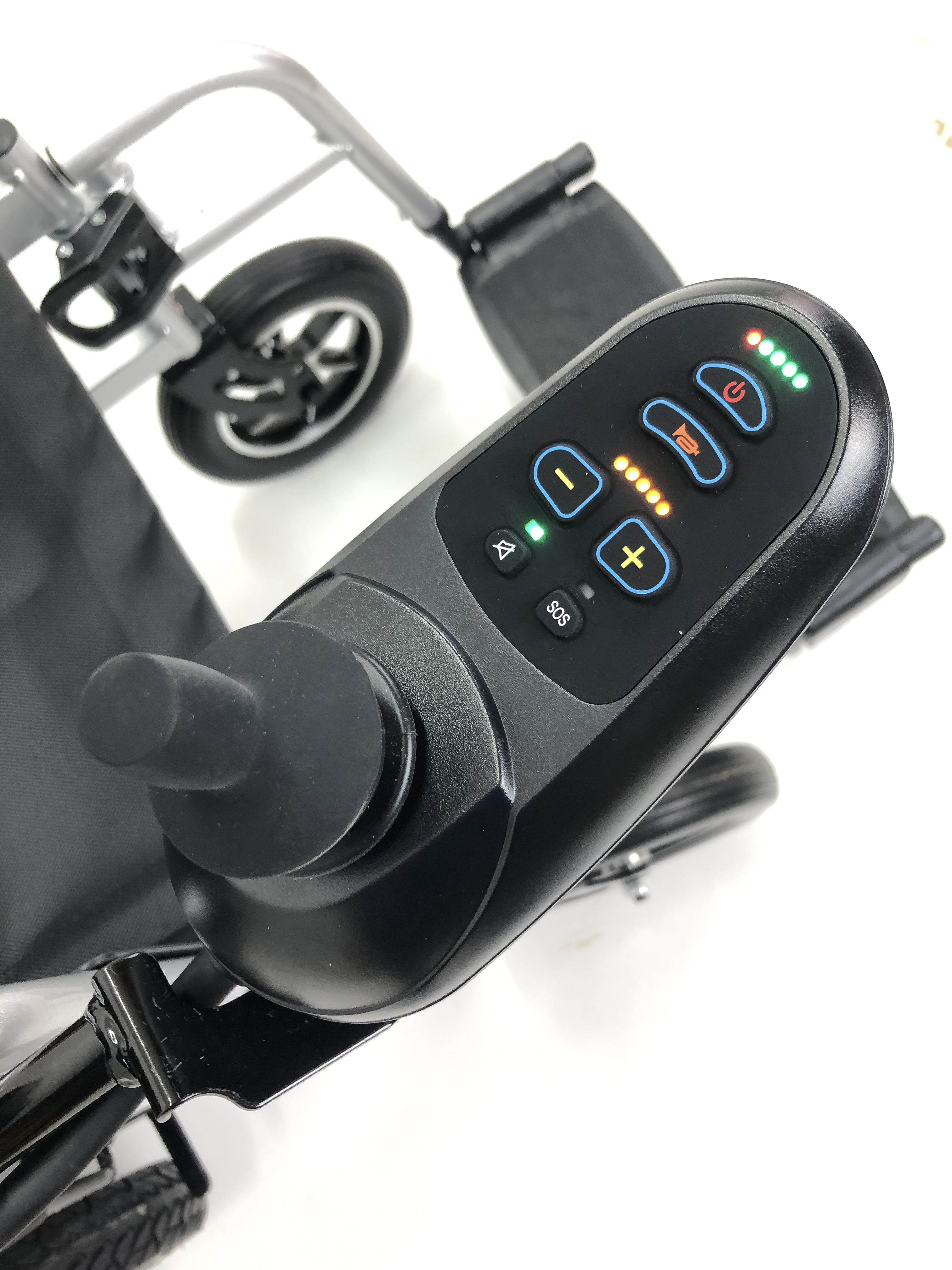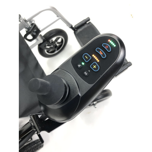 Керування здійснюється за допомогою інтуїтивного джойстика, який легко налаштовується під праву чи ліву руку користувача. Така система дозволяє повністю контролювати швидкість і напрямок руху, забезпечуючи плавний хід і маневреність навіть у вузьких приміщеннях.