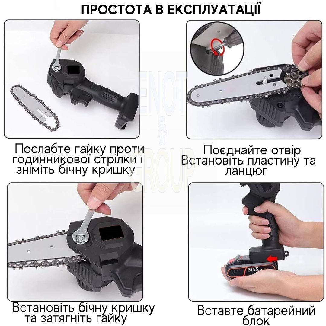 - Легке обслуговування: швидка заміна ланцюга та зручний доступ до акумулятора полегшують догляд за інструментом.