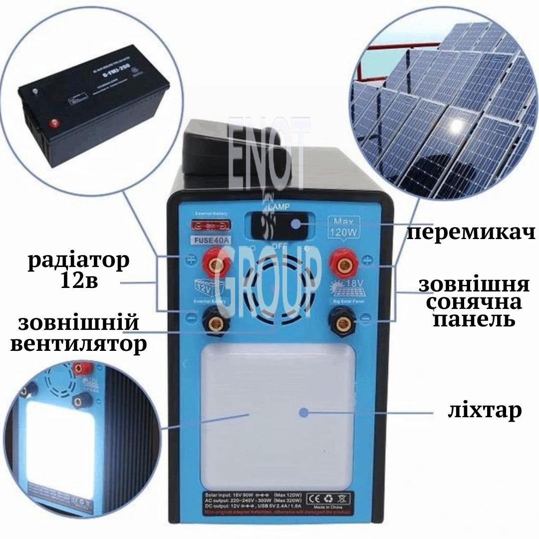 Генератор сонячної енергії Solar Power Light System LM-9300 — це надійне джерело енергії для автономного використання. Він дозволяє забезпечити ваш будинок електроенергією завдяки сонячній енергії, що є екологічно чистим і економічним рішенням. Ідеально підходить для дому, дачі, кемпінгу та інших місць, де потрібна автономна система електроживлення.
