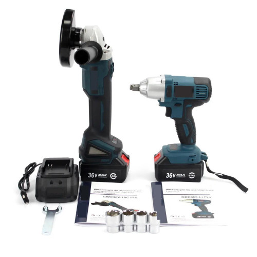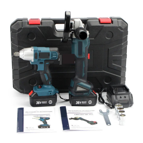 Цей потужний набір 2в1 від Instrumentop стане ідеальним вибором для тих, хто цінує надійність і продуктивність. Комплект включає гайковерт GDR360-LI та болгарку GWX36V-10C, обидва працюють на 36-вольтових акумуляторах ємністю 5 ампер-годин, що забезпечує тривалий час роботи без потреби в частій підзарядці.