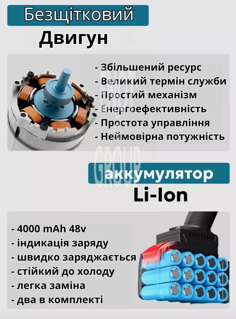 - Два акумулятори 48V: Забезпечують тривалу автономну роботу без необхідності частого заряджання, що робить пилу ідеальною для тривалих завдань.