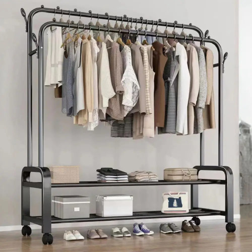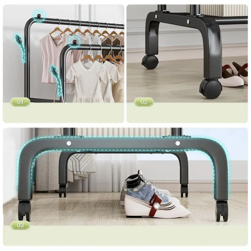 Мобільність конструкції забезпечують зручні коліщатка — переміщати вішалку можна навіть у повністю завантаженому стані. Стильний мінімалістичний дизайн легко вписується у будь-який інтер’єр — від сучасних квартир до офісних приміщень. Це практичне та функціональне рішення для тих, хто цінує порядок і комфорт.