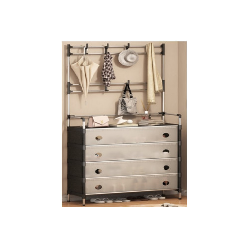 DXXMJ 6205HB — сучасне рішення для організації простору у передпокої. Ця біло-чорна вішалка 3-в-1 поєднує: крючки для одягу, верхню полицю для дрібниць та багаторівневу підставку для взуття. Завдяки міцному металевому каркасу, пластиковим з'єднанням і стильному контрастному дизайну, вона ідеально впишеться в інтер'єр будь-якої квартири, офісу чи дачного будинку.