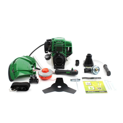 Основні складові мотокоси включають різальний елемент, штангу з ведучим валом та рукояткою для управління, а також двигун з паливним баком і механізмами. Завдяки своїй легкості та здатності до розбирання, вона ідеально підходить для транспортування та технічного обслуговування. Для додаткового комфорту можна встановити плечовий ремінь на штангу.