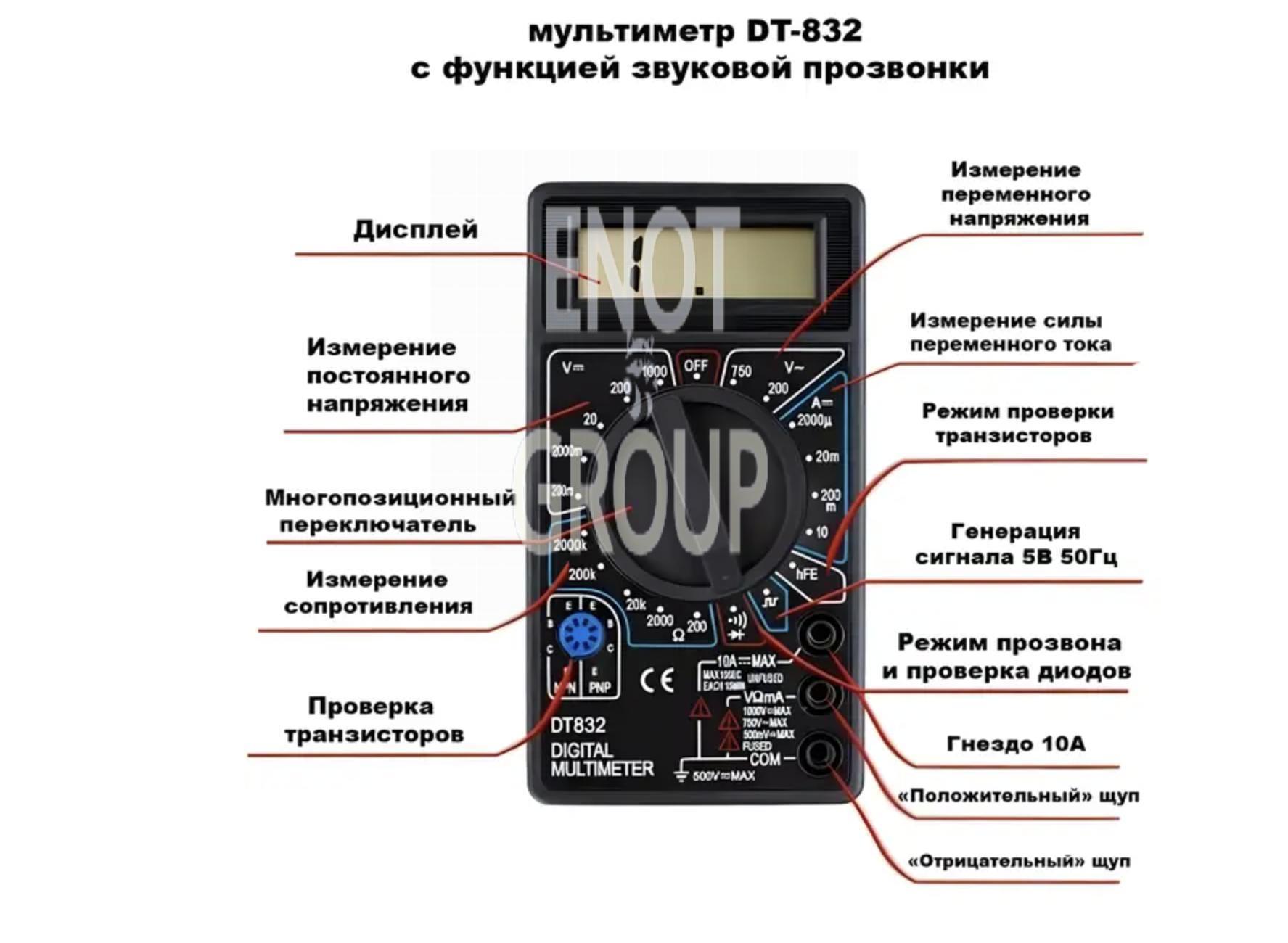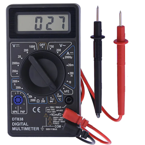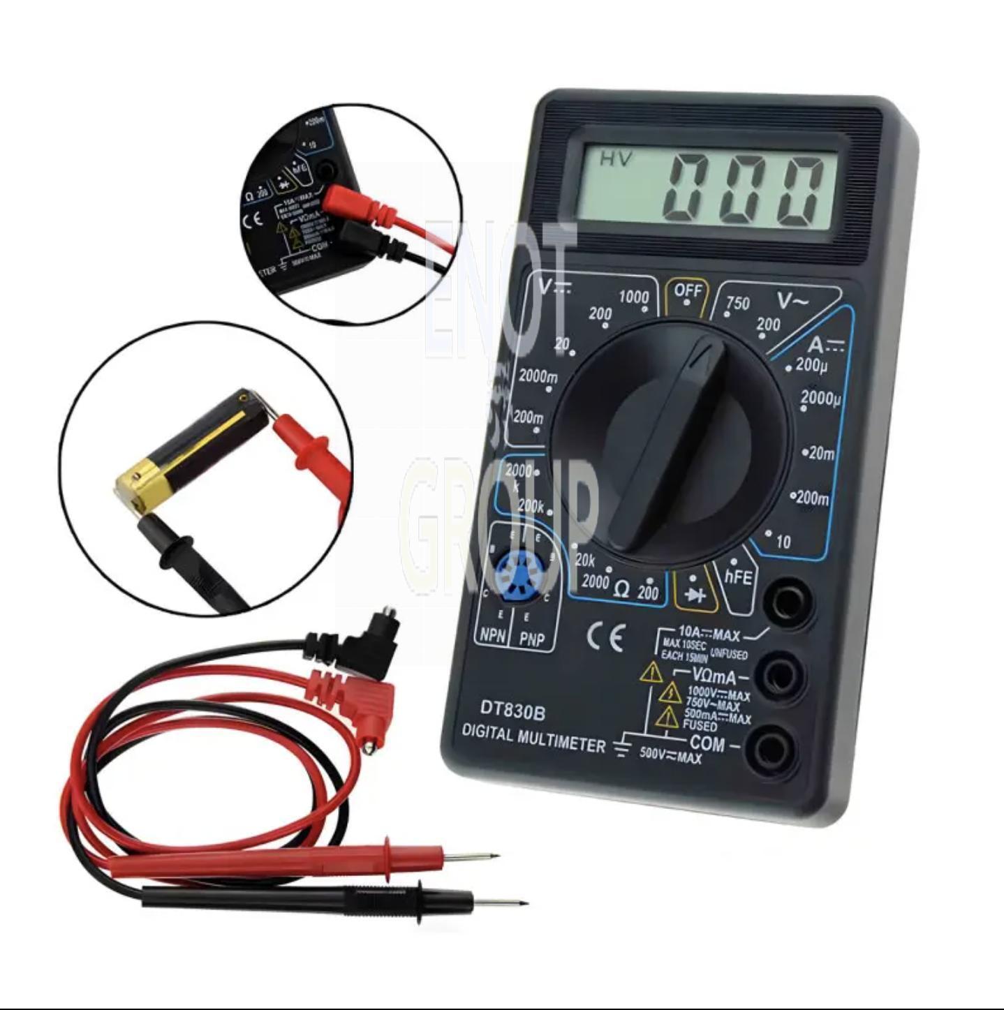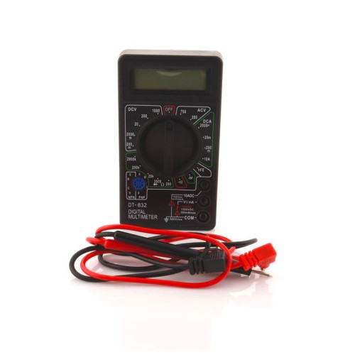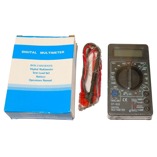 Цифровий мультиметр DT 832 – це потужний і компактний інструмент, що ідеально підходить для електриків, техніків та домашніх майстрів. З його допомогою ви зможете швидко і точно вимірювати постійну та змінну напругу, струм, опір, а також перевіряти діоди і транзистори.