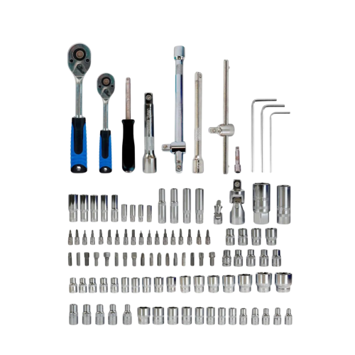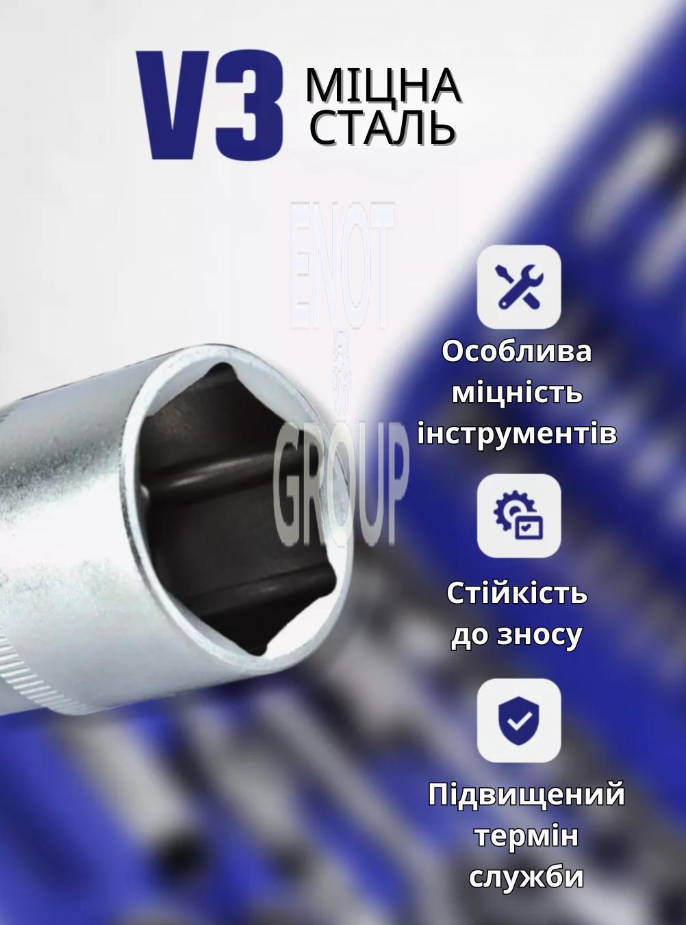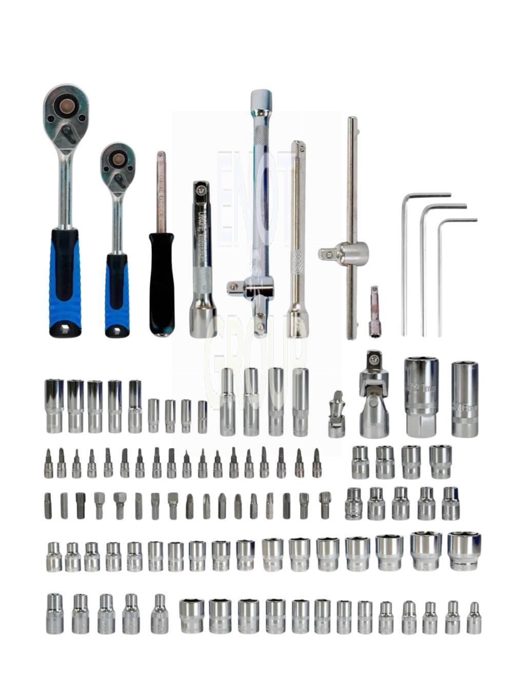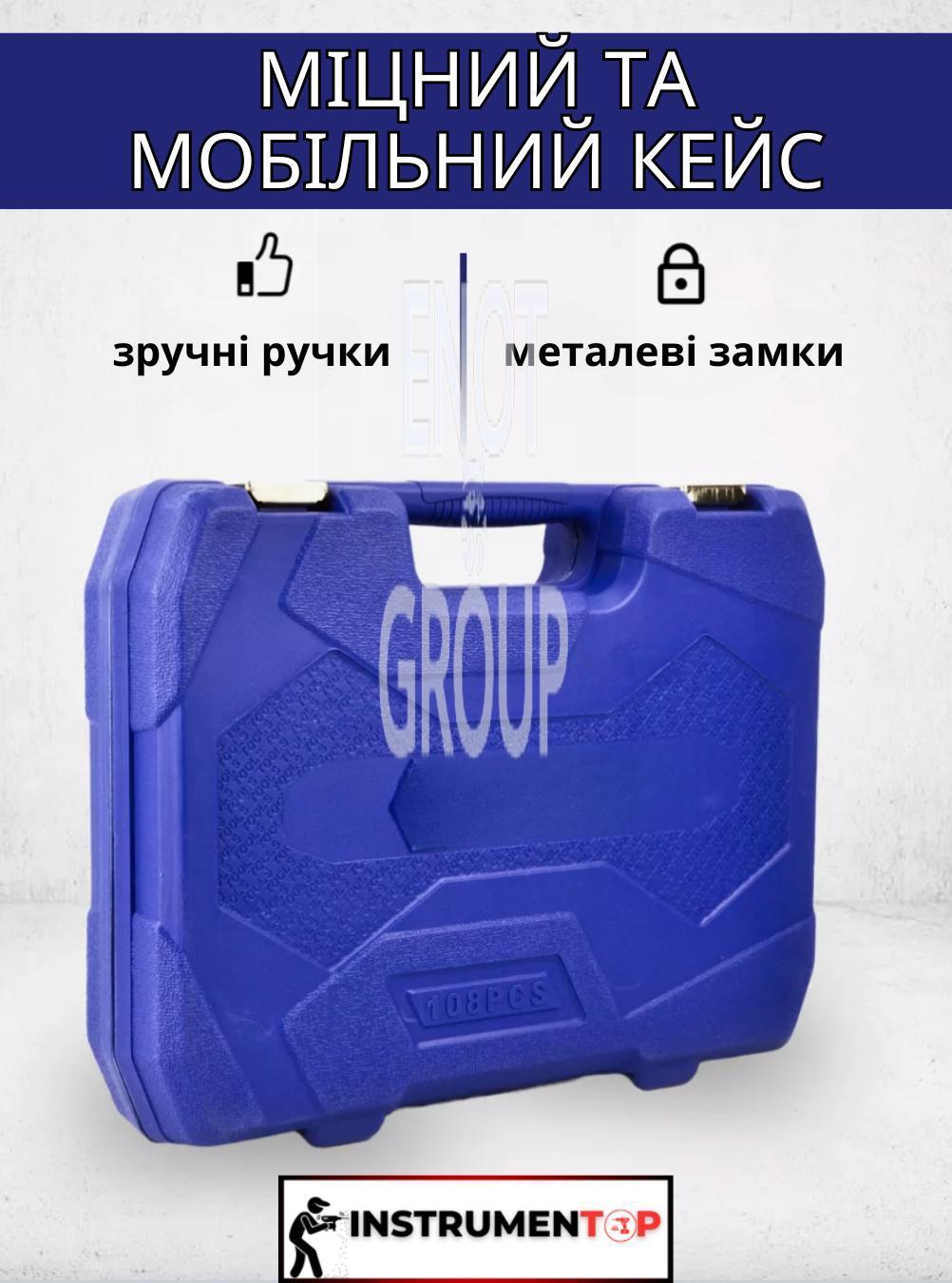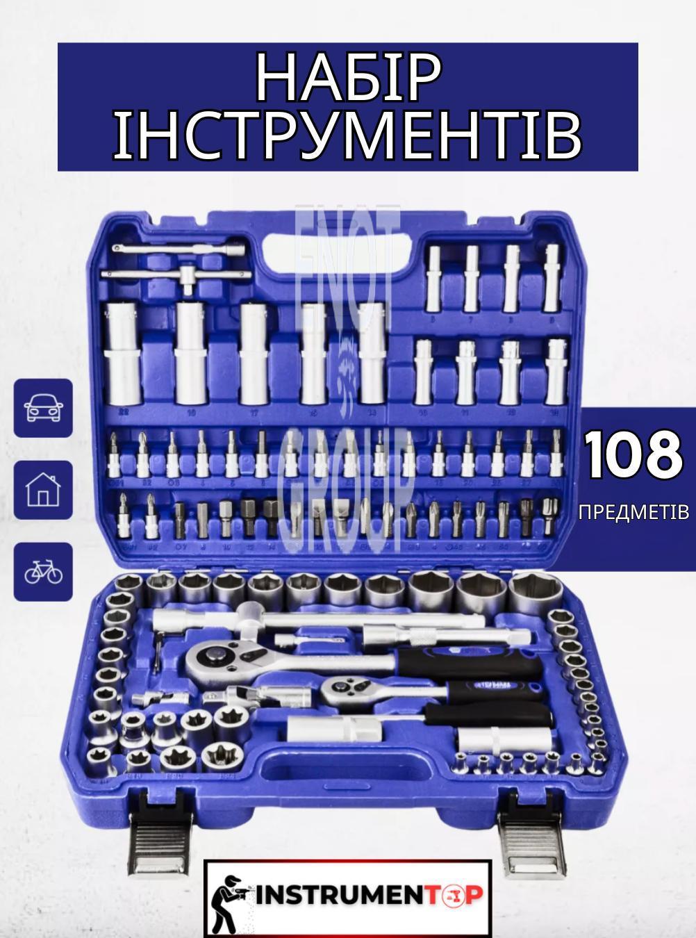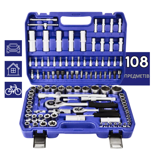 - 108 предметів: Широкий асортимент інструментів, що включає головки різних розмірів, тріскачки, подовжувачі та інші насадки для вирішення різних ремонтних завдань.