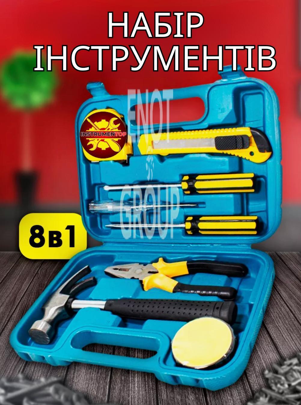 Обирайте набір інструментів на 8 предметів у пластиковому кейсі і насолоджуйтеся комфортом і ефективністю в кожному вашому проекті!