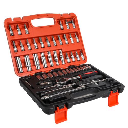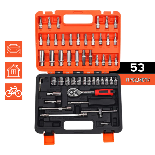 - 53 предмети: У набір входять ключі, викрутки, плоскогубці, молоток, гайкові ключі та інші інструменти для різноманітних ремонтних завдань.