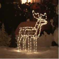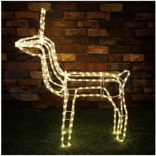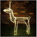 Конструкція виконана з міцного дюралайту, що формує чіткі контури оленя, а енергоощадні LED-лампи забезпечують яскраве світіння з мінімальним споживанням електроенергії. Завдяки водостійкому корпусу (IP65), фігура ідеально підходить для зимових умов — її можна встановлювати на фасадах будинків, у дворі, на терасах чи біля ялинки.
