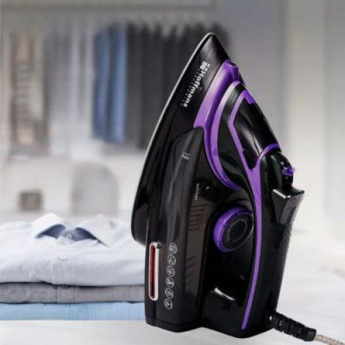 Модель оснащена антипригарною керамічною підошвою, яка рівномірно розподіляє тепло, забезпечує легке ковзання по тканині і захищає одяг від прилипання та подряпин. Паровой удар та вертикальне відпарювання дозволяють обробляти костюми, сукні, пальта, штори та інший текстиль без прасувальної дошки.