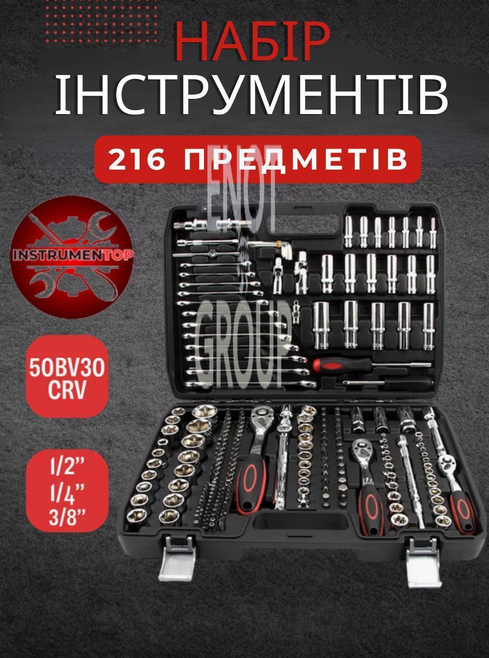 Обирайте Професійний набір інструментів на 216 предметів у зручному пластиковому кейсі та отримайте надійність і якість в кожному проекті!