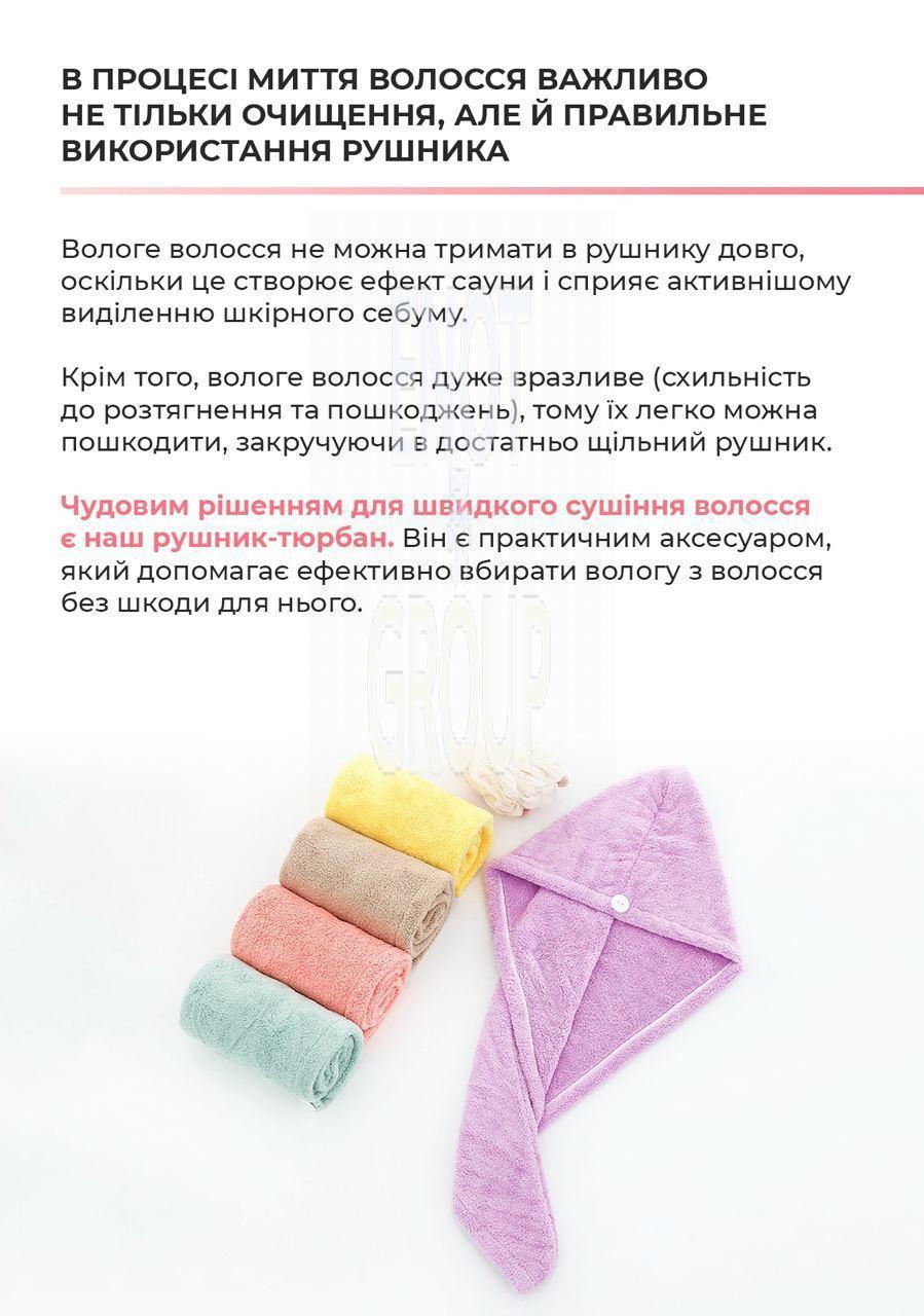 - Дбайливий догляд: Завдяки м'якій текстурі, рушник не пошкоджує волосся і зменшує ламкість, дозволяючи їм зберігати природний блиск і здоров'я.