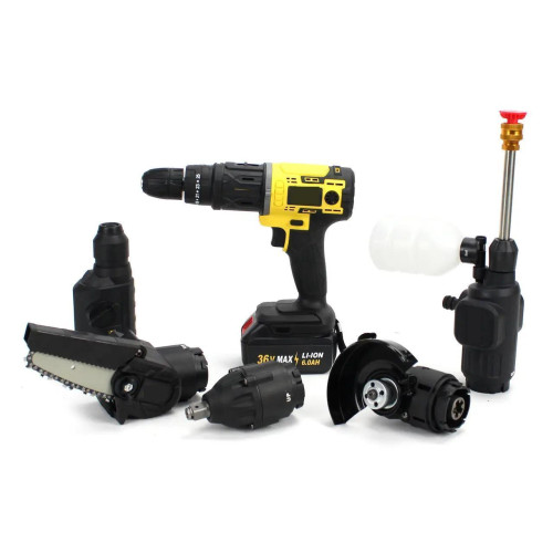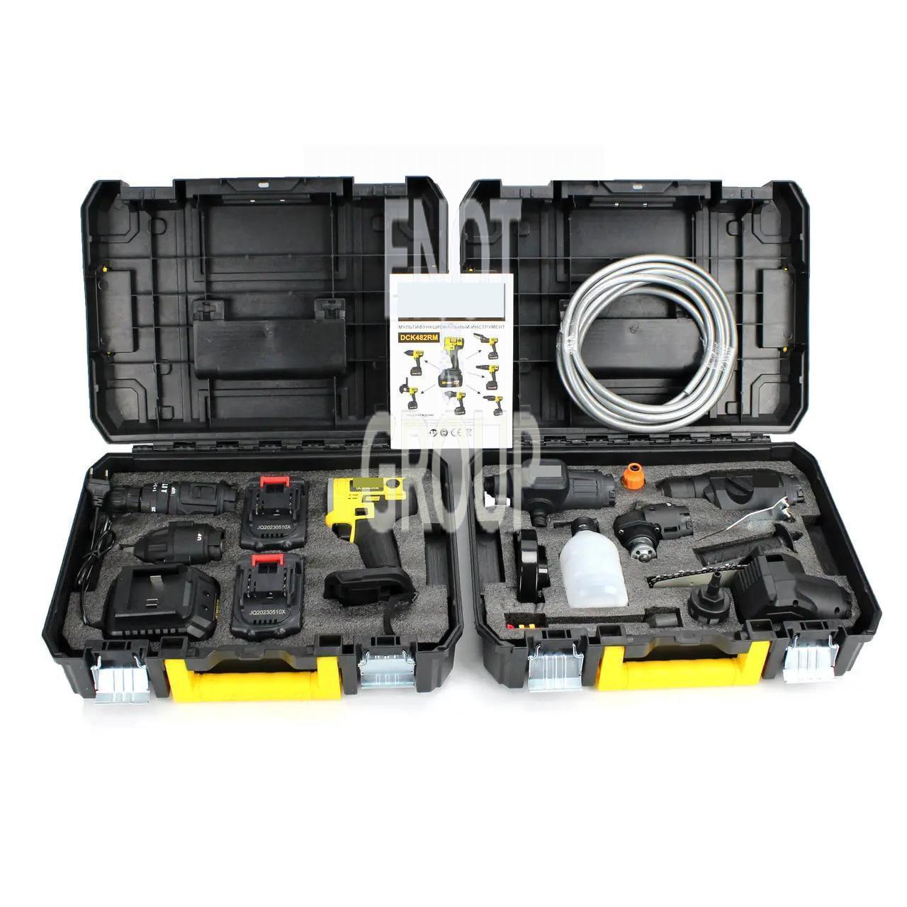 - Насадки: шуруповерт, пила, гайковерт, перфоратор, УШМ, мийка — по 1 шт.