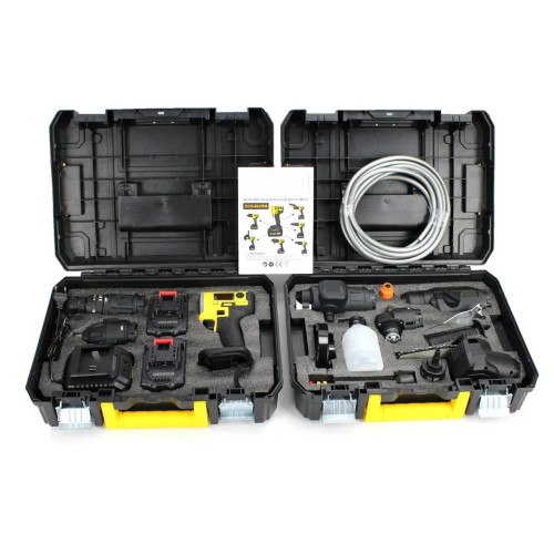 У комплект входять: шуруповерт, пила, гайковерт, УШМ, перфоратор та мийка. Це дозволяє користувачу мати все необхідне для роботи в одному наборі. Шуруповерт з потужним крутним моментом легко впорається із закручуванням та відкручуванням гвинтів, пила дозволяє різати різні матеріали, включаючи дерево та метал, а гайковерт забезпечить точне закручування гайок та болтів.