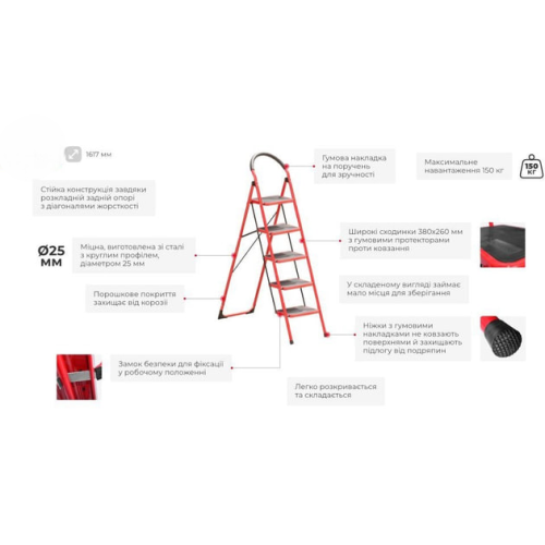 Особливості: поручень з гумовою накладкою, система безпеки, протиковзні ніжки