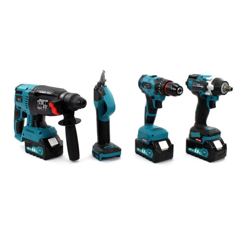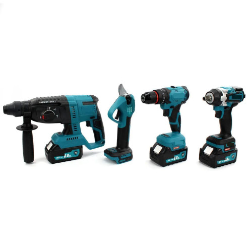 Комплект включає 4 акумулятори 36V/6.0Ah, що забезпечують тривалу автономну роботу кожного інструмента, а зарядний пристрій дозволяє швидко відновити енергію для наступного використання. Все це зібрано в міцному пластиковому кейсі, що забезпечує зручність транспортування і зберігання.