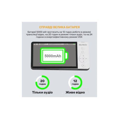 Цифрова відео-няня з 5-дюймовим екраном — це ідеальне рішення для турботливих батьків. Великий дисплей забезпечує чітке зображення вашого малюка, а розширені функції роблять щоденний догляд зручним і безпечним.