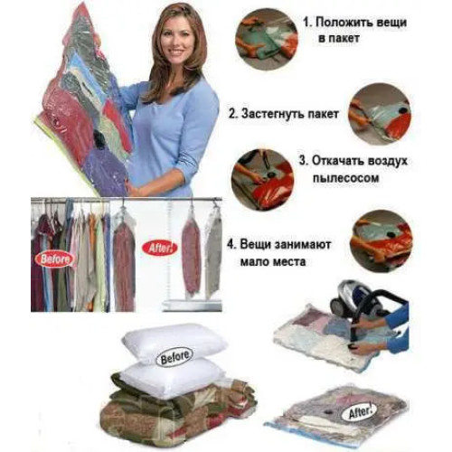 Вакуумні пакети для зберігання речей – це ідеальне рішення для тих, хто хоче заощадити місце в шафі. Вони ефективно стискають одяг, ковдри, подушки та інші об'ємні предмети, зменшуючи їх обсяг до 2-3 разів! Ідеально підходять для домашнього та сезонного зберігання.
